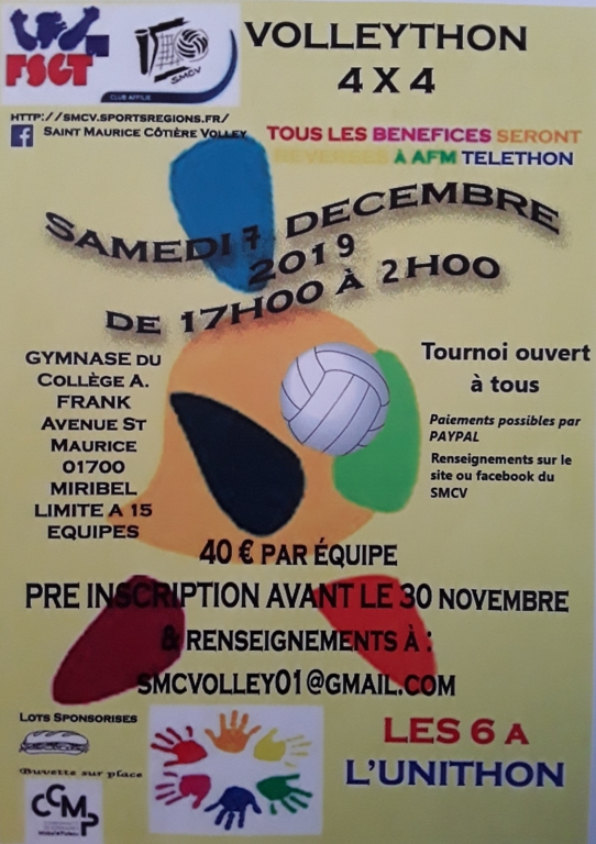 Tournoi de volley-ball au profit du Téléthon. 40 euros par équipe. 5 euros de plus pour chaque joueur supplementaire souhaitant un t-shirt. Règlement possible par Paypal : https://paypal.me/pools/c/8j0TBldYUM
